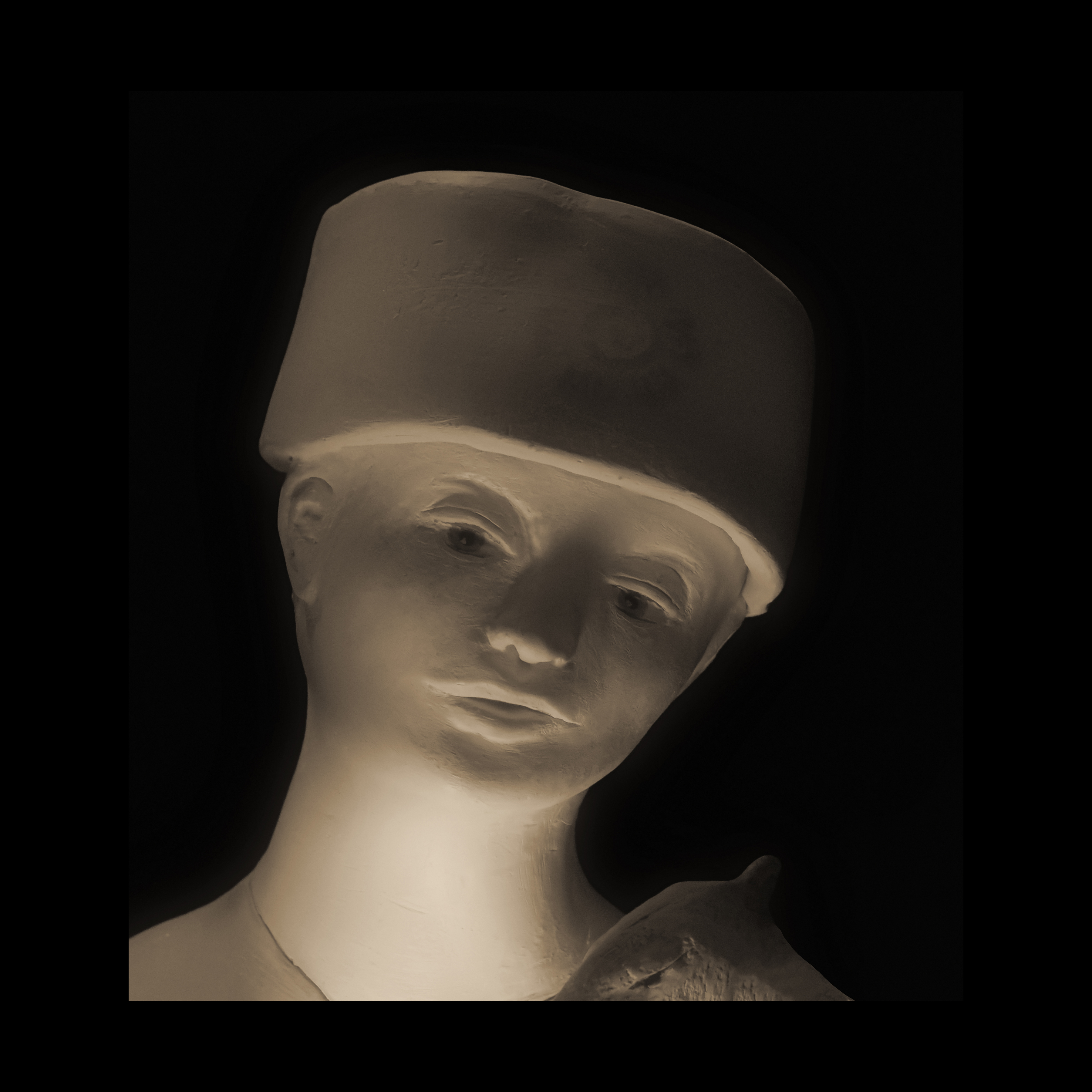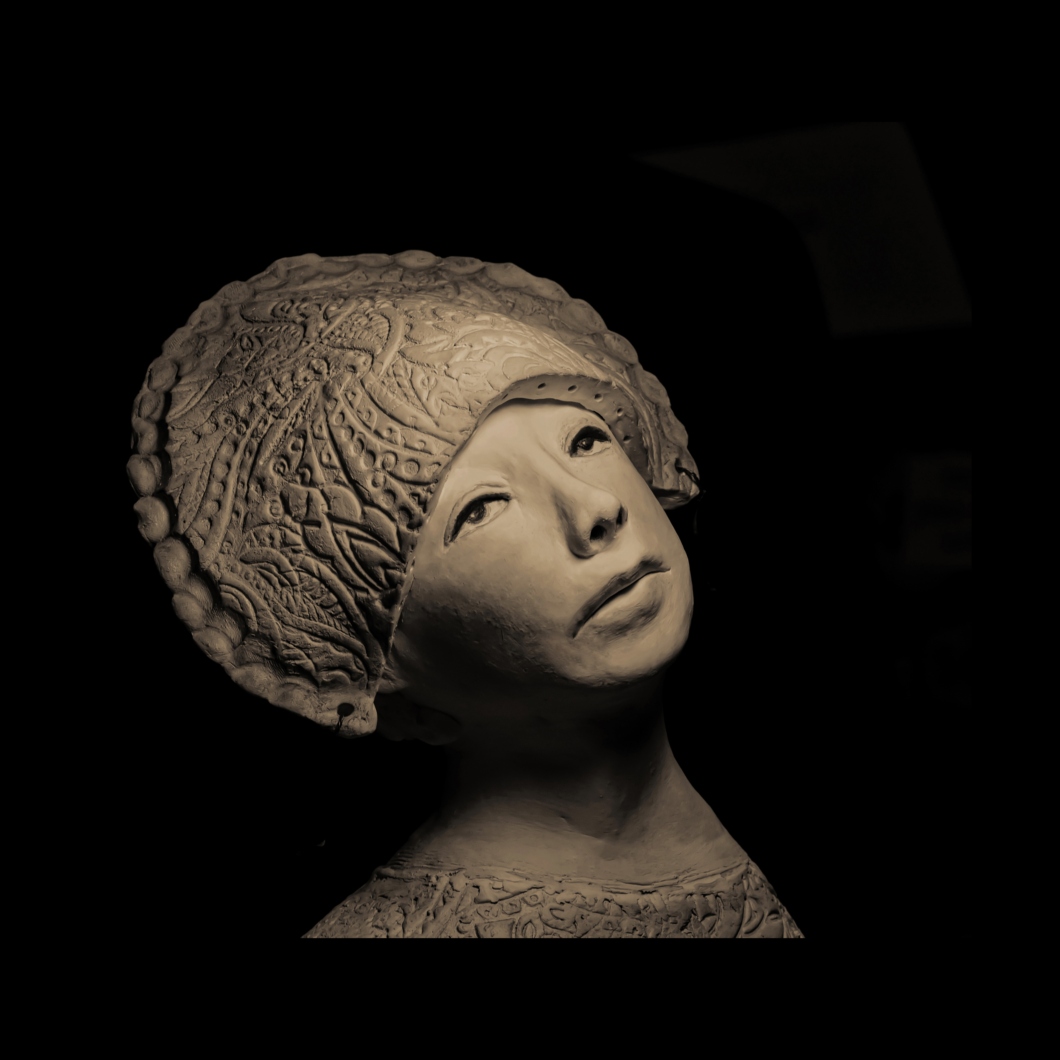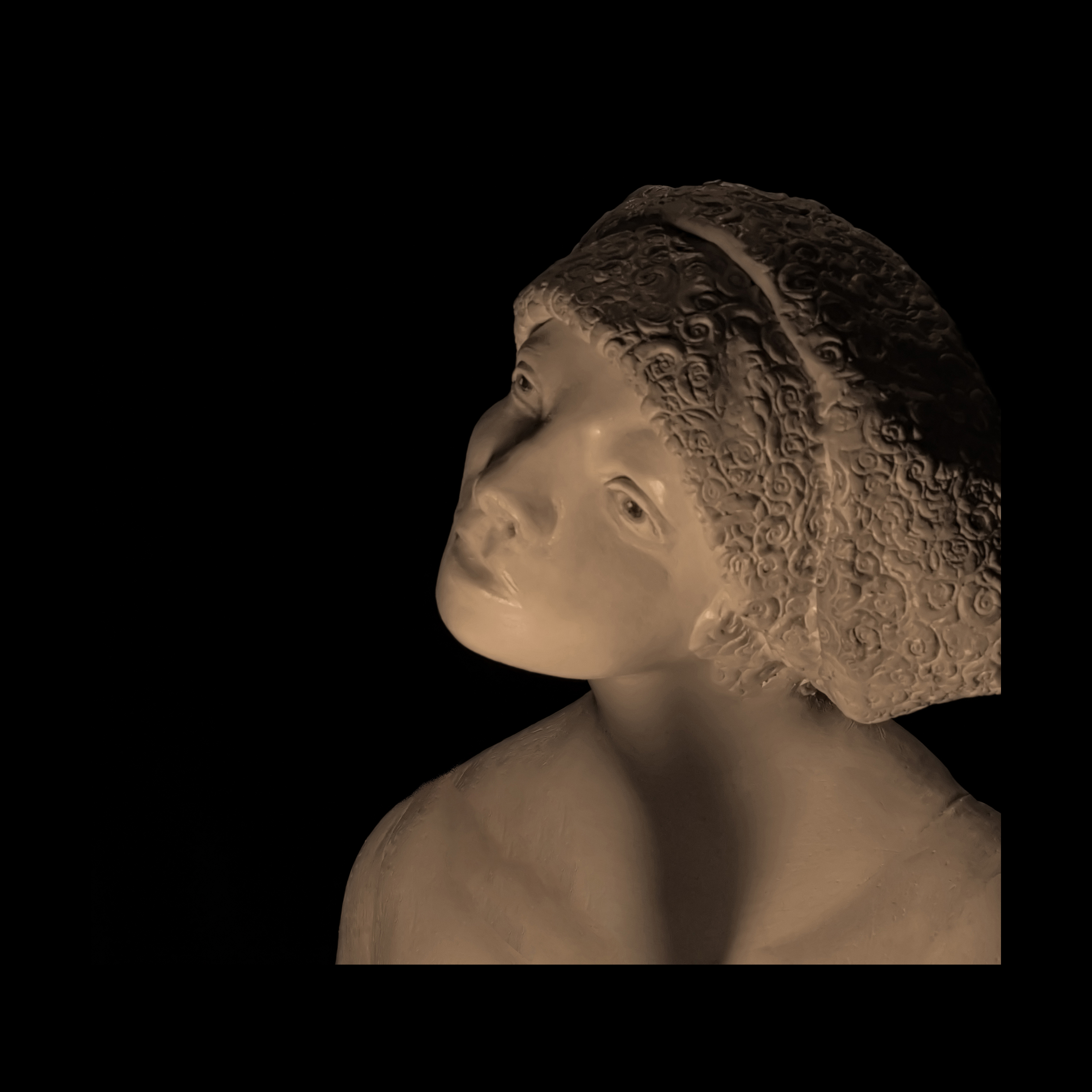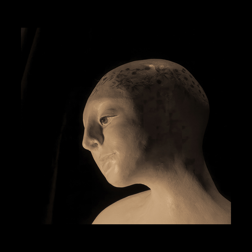Susan Fiori crea elegantes esculturas emocionales. Aquí solo los rostros están bañados en sombras.
