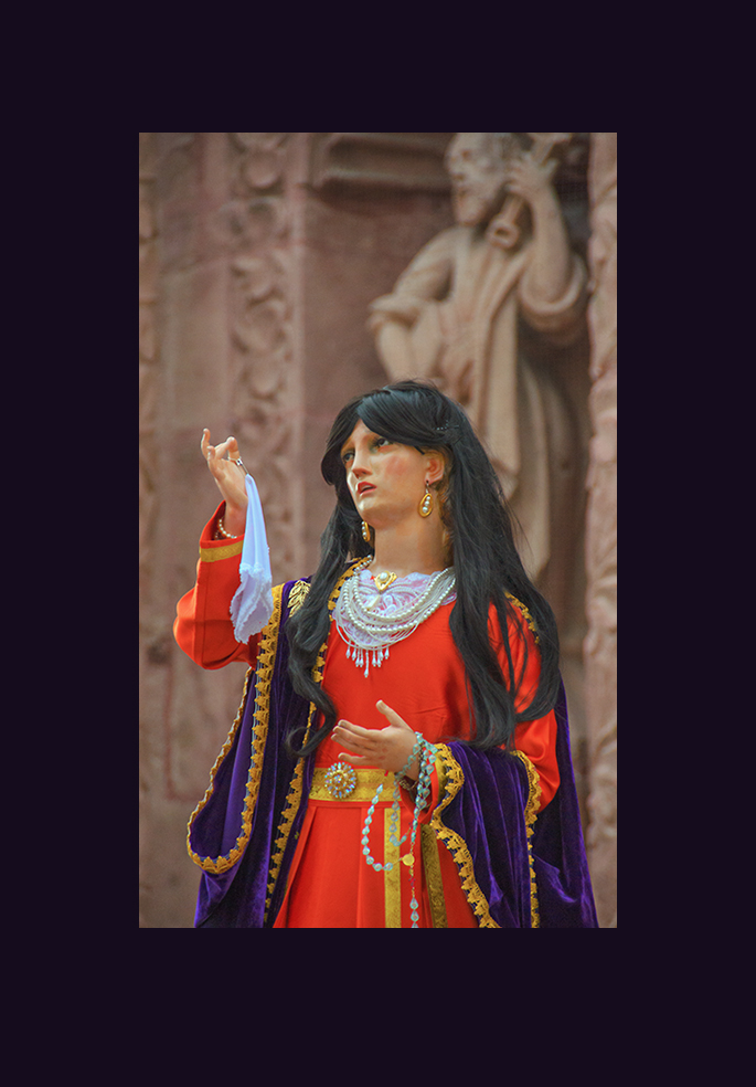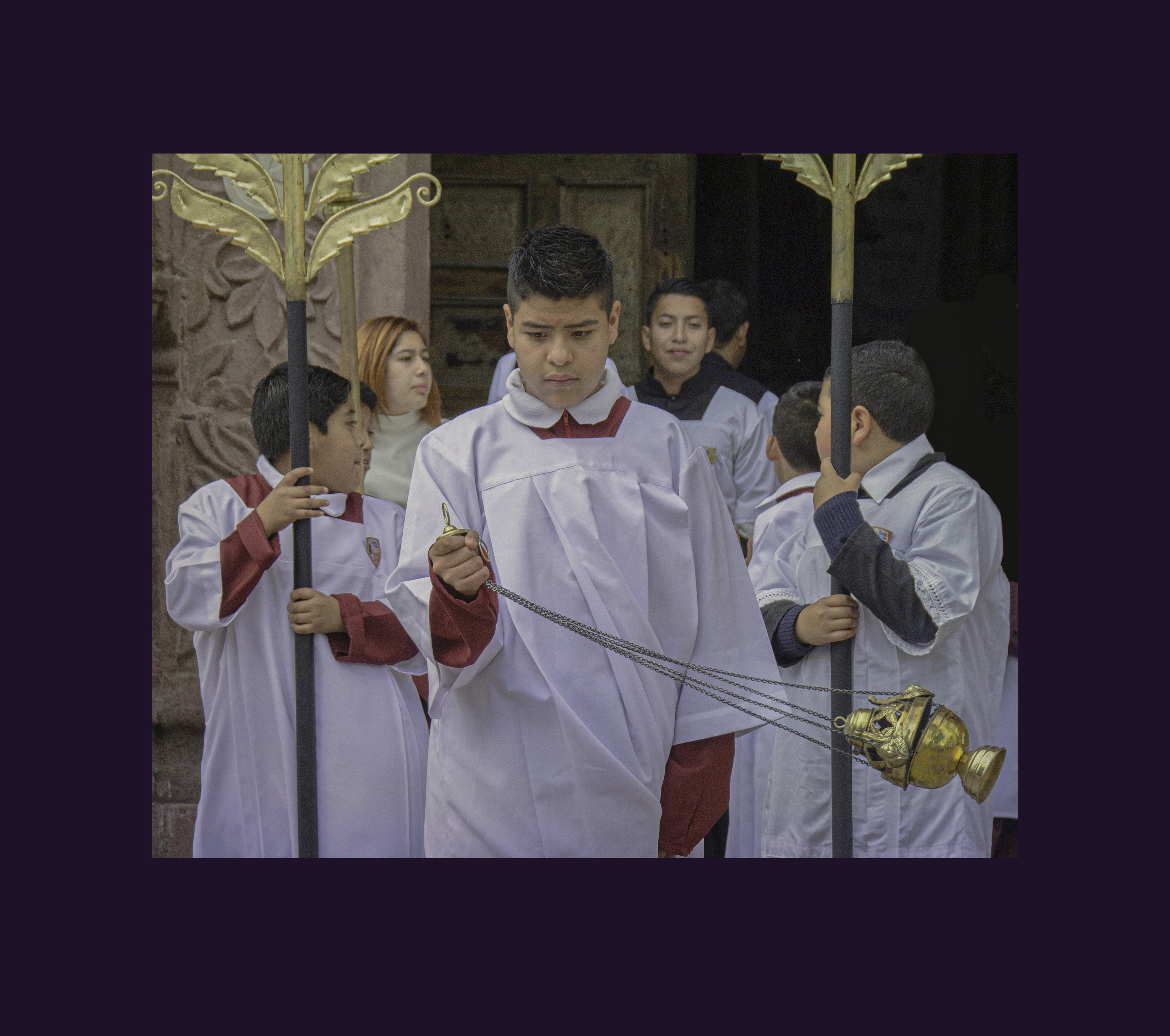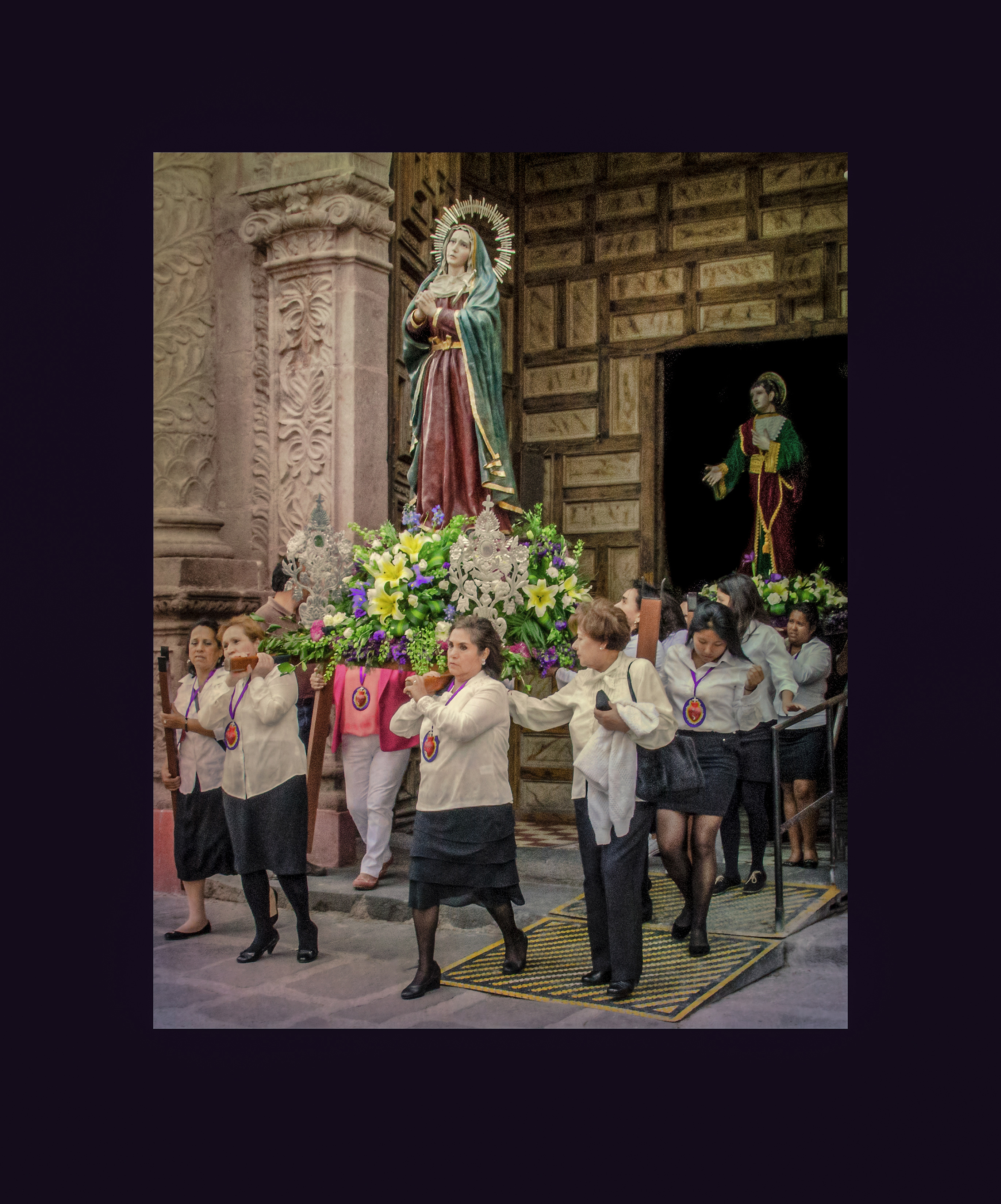 Good Friday is a day of cardinal importance in Mexico, a day when all of Mexico commemorates the passion and death of Jesus Christ. In San Miguel de Allende Susan and I have witnessed several times the procession that originates from the Oratorio de San Felipe Neri (which dates from 1712) and comes to an end in El Jardin in front of the La Parroquia (the parish church of San Miguel built in 1683). The procession is unmistakably dominated by the color purple, the color of lent , and ponderous life-sized statues, shouldered by both men and women. The women often wear shoes with 2” heels to increase their hardship. I attach some images which I gathered with great respect.