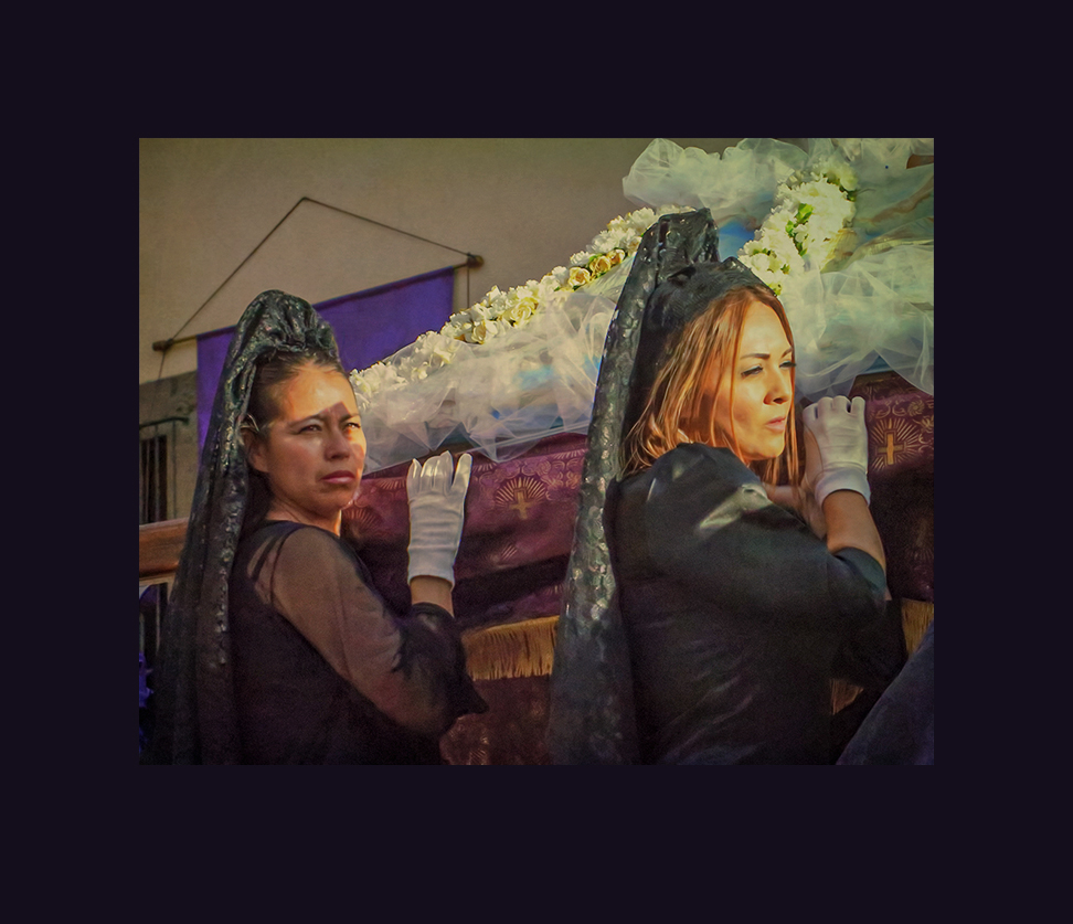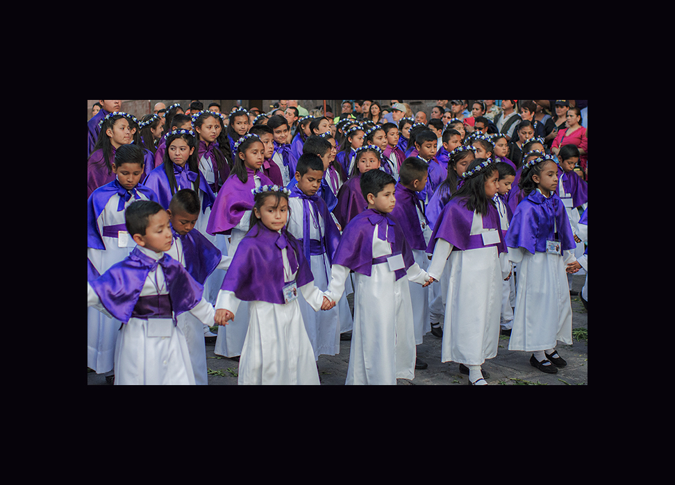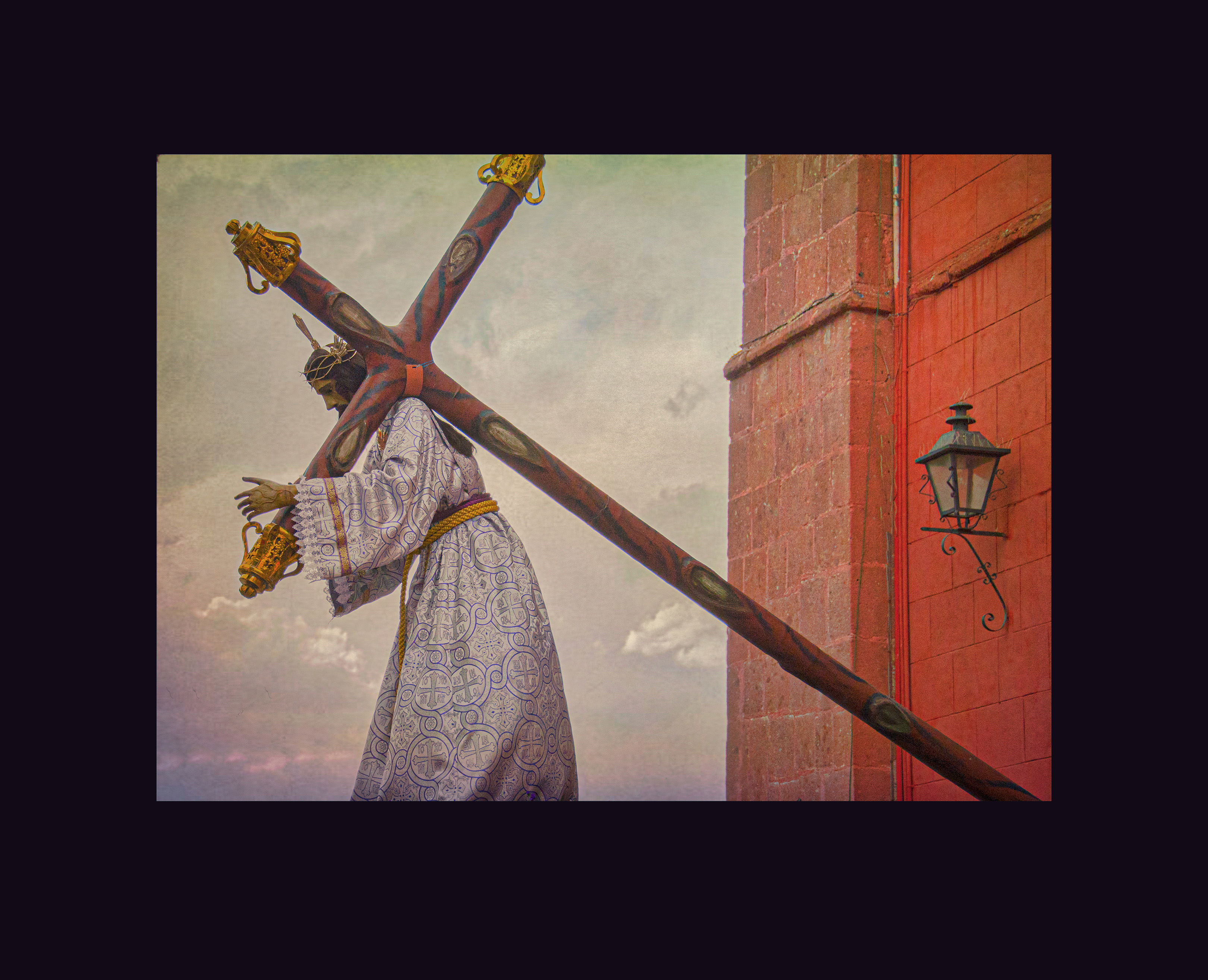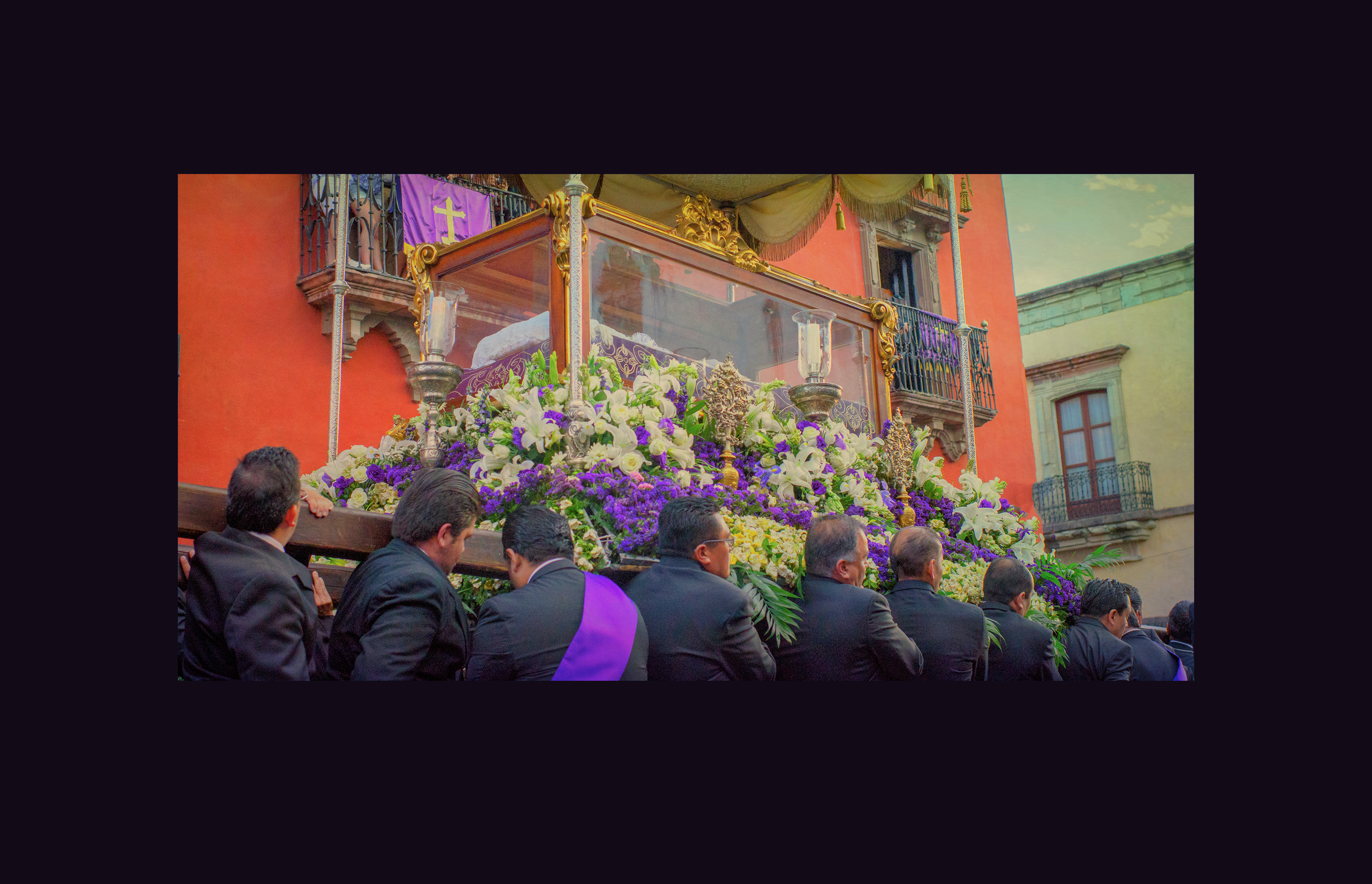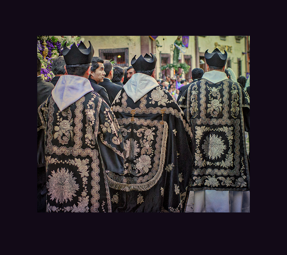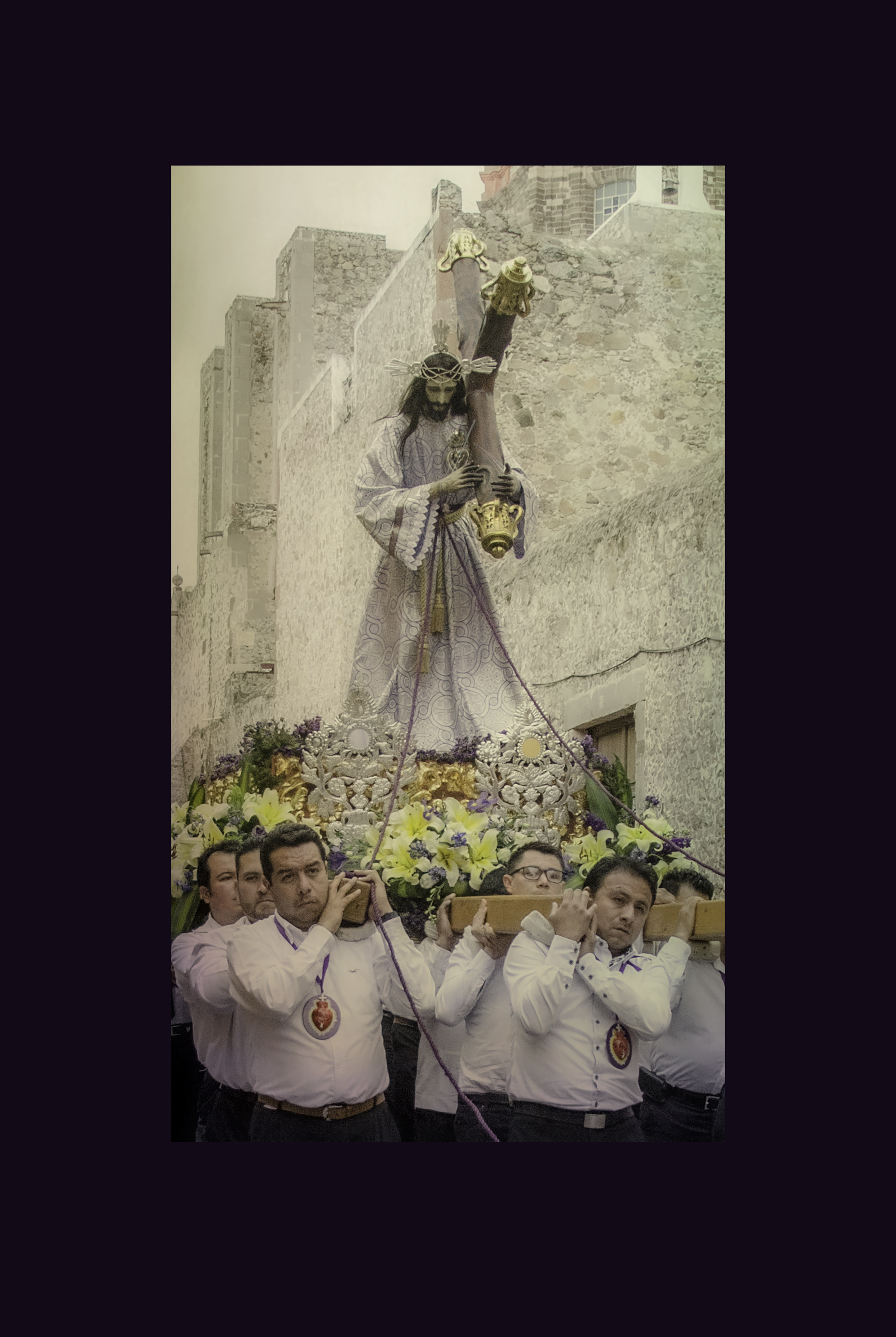 El Viernes Santo es un día de importancia cardinal en México, un día en el que todo México conmemora la pasión y muerte de Jesucristo. En San Miguel de Allende Susan y yo hemos sido testigos varias veces de la procesión que se origina en el Oratorio de San Felipe Neri (que data de 1712) y llega a su fin en El Jardín frente a La Parroquia (la iglesia parroquial de San Miguel construida en 1683). La procesión está claramente dominada por el color púrpura, el color de la Cuaresma y las pesadas estatuas de tamaño natural, llevadas por hombres y mujeres. Las mujeres a menudo usan zapatos con tacones de 2” para aumentar sus dificultades. Adjunto algunas imágenes que reuní con gran respeto.